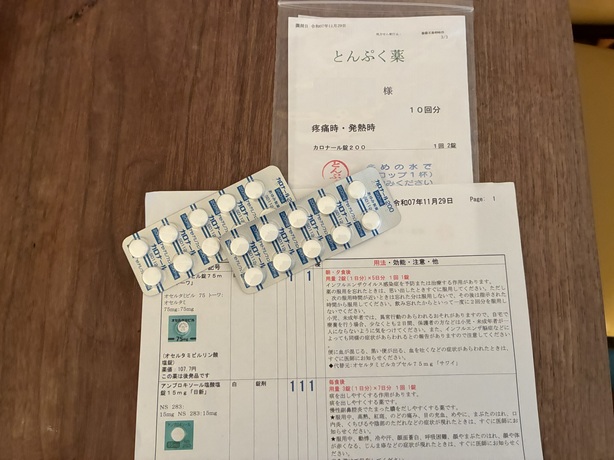 8時半に耳鼻科で検査。また車まで先生が完全防備の体で検査に来てくれました。その後、スマホに電話が来てコロナが陰性なので、診察室まで来てくださいとのこと。いいのかな?このご時世でもコロナ>インフルという扱いなのでしょうか?カロナールが効いていたのか診察では37.5℃。検査はやはりインフルエンザA型が陽性で、下記のとおり処方せんをもらいました。この先生は有無を言わさずタミフルでした。