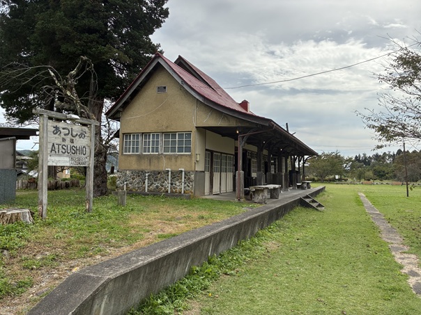 その後はさらに米沢方面に走って日中線記念館に行きます。昭和59年に廃線となった国鉄日中線の終着熱塩駅舎を活用した資料館です。廃止時には朝と夕方の三往復しかない超閑散ローカル線で「日中は走らぬ日中線」と揶揄されていた路線ですがおしゃれな駅舎。