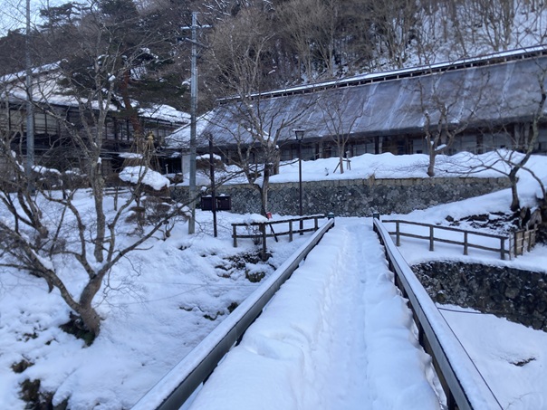 別棟の菊水館に渡る橋は除雪がされておらず30cmくらい積もった圧雪の状態。渡ろうとしたのですが、めまい持ちの身としてはこの欄干があってないような状態は川に転落しそうでとても怖い。少し渡ろうとしたあと、諦めました。