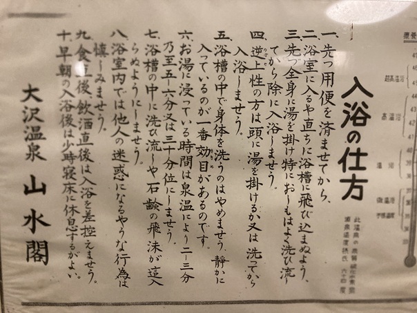 入浴の仕方の貼紙。旧仮名遣いで書かれているので戦前のものでしょうか?「逆上症の方」というのが読めなかったのですが「のぼせしょう」とのこと。「先ず用便を済ませてから」だそう。