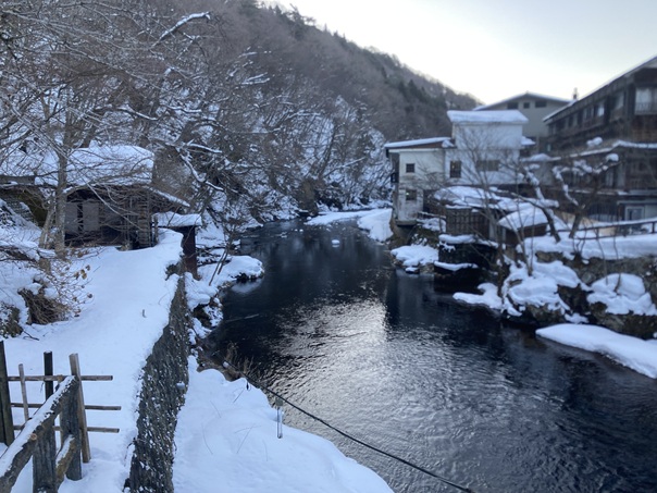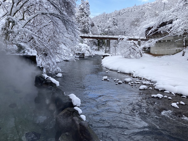 露天風呂から眺める雪景色は最高!といいたいところですが、このくらいの時期になると朝はマイナス10℃くらいまで下がるので、そのなかで全裸になるのが辛いところ。凍えた後つかる大沢の湯もまたいいものかも知れません。よく温まるお湯なので、少しつかれば雪見風呂の至福の気分になれると思います。