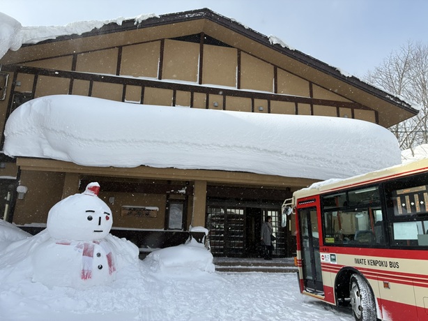乗り換えてからは森の中を登っていき20分ほどで松川温泉峡雲荘に到着です。大きな雪だるまがお出迎えしてくれます。週初めから雪が降り続いたようでかなりの積雪です。