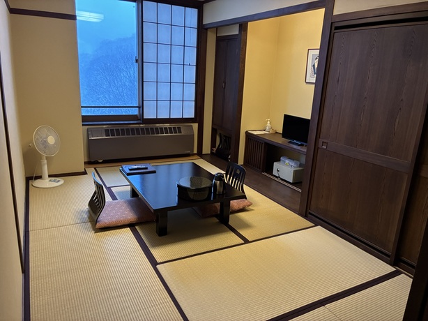 チェックインして案内された2階の部屋がこちら。二泊三日こちらでのんびりするつもりです。奥のほうにあるヒーターには温泉の蒸気が通っていて、部屋は暑いくらいになります。蒸気については温度、量ともに調節不能なので窓を開けるほかありません。この部屋であれば3cmくらいあけるとちょうどいい感じになりました。微妙に不便ですがこれもまた楽しい。