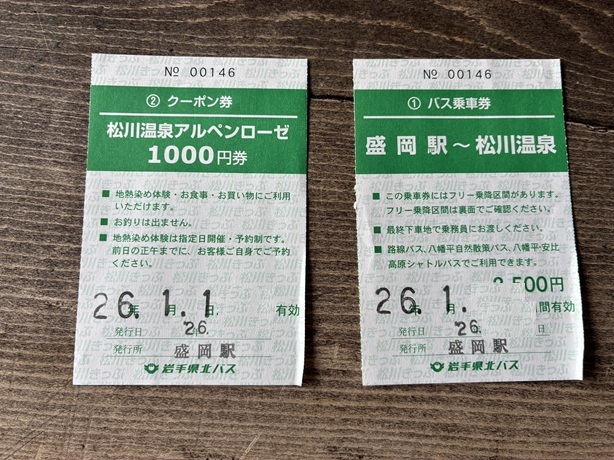 キャンペーンの特別乗車券2,500円を購入します。普通に買うと往復でも2,700円なのですが、アルペンローゼという松川温泉近くにあるお店の1,000円券までついてお得です。ただし、宿からお店までは1km弱あり雪の中を歩くのもしんどいので行かずじまいでした。