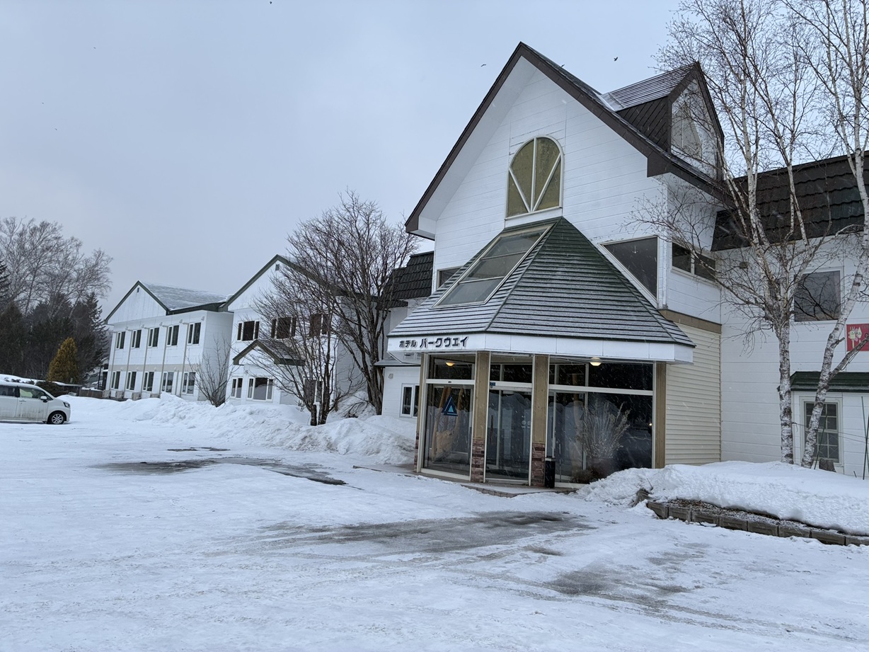あとは鈍行に乗って1時間で川湯温泉へ。半年前にも泊まったホテルパークウェイに到着です。駅から徒歩5分ほどですが、この時間は雪が降っていて寒い。