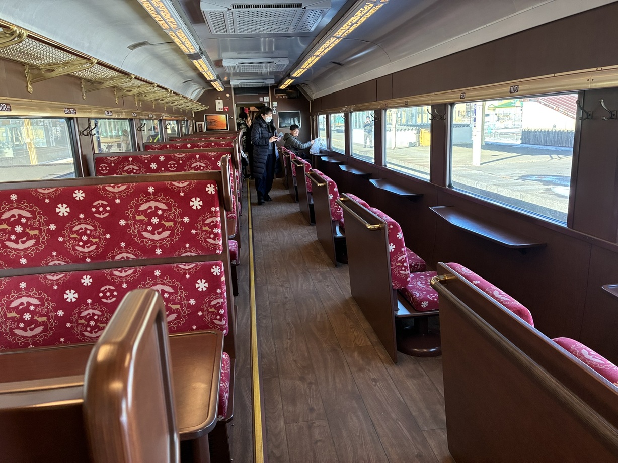 こちらが乗車した「たんちょうカー」湿原を見るには窓向きの席がいいのですが、キャンセルされた一席ということで四人掛けの逆向き窓側で、あまりいい席ではなかったのですが贅沢は言えません。