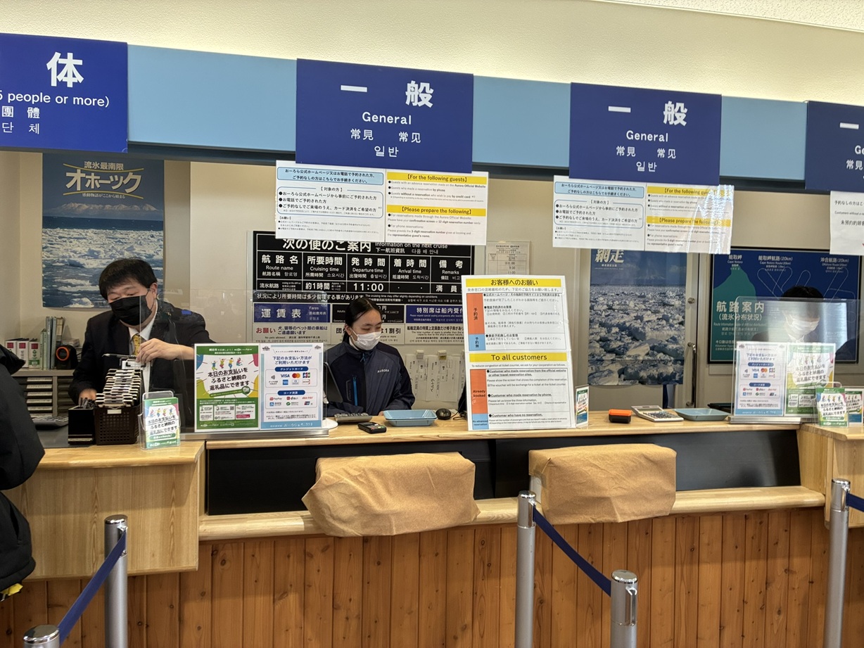 話を聞くとキャンセル待ちを受け付けているので、出港15分前に来てくれとのこと。順に呼び出すと言われ渡された番号は「7番」でした。網走駅の観光案内所で早めに行けというのはこういう意味だったのでしょう。ここらへんの事情もう少しちゃんと教えて欲しかった…