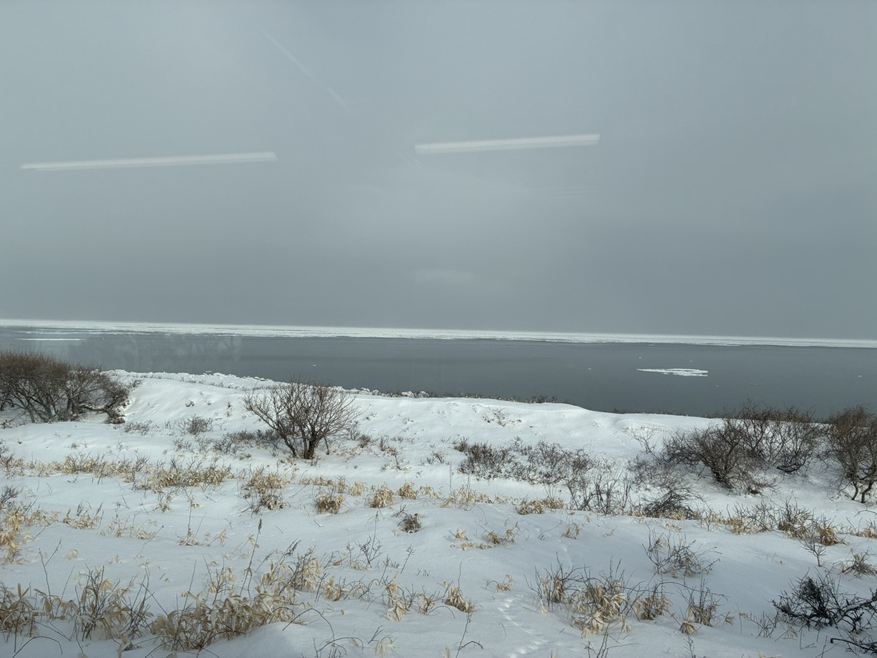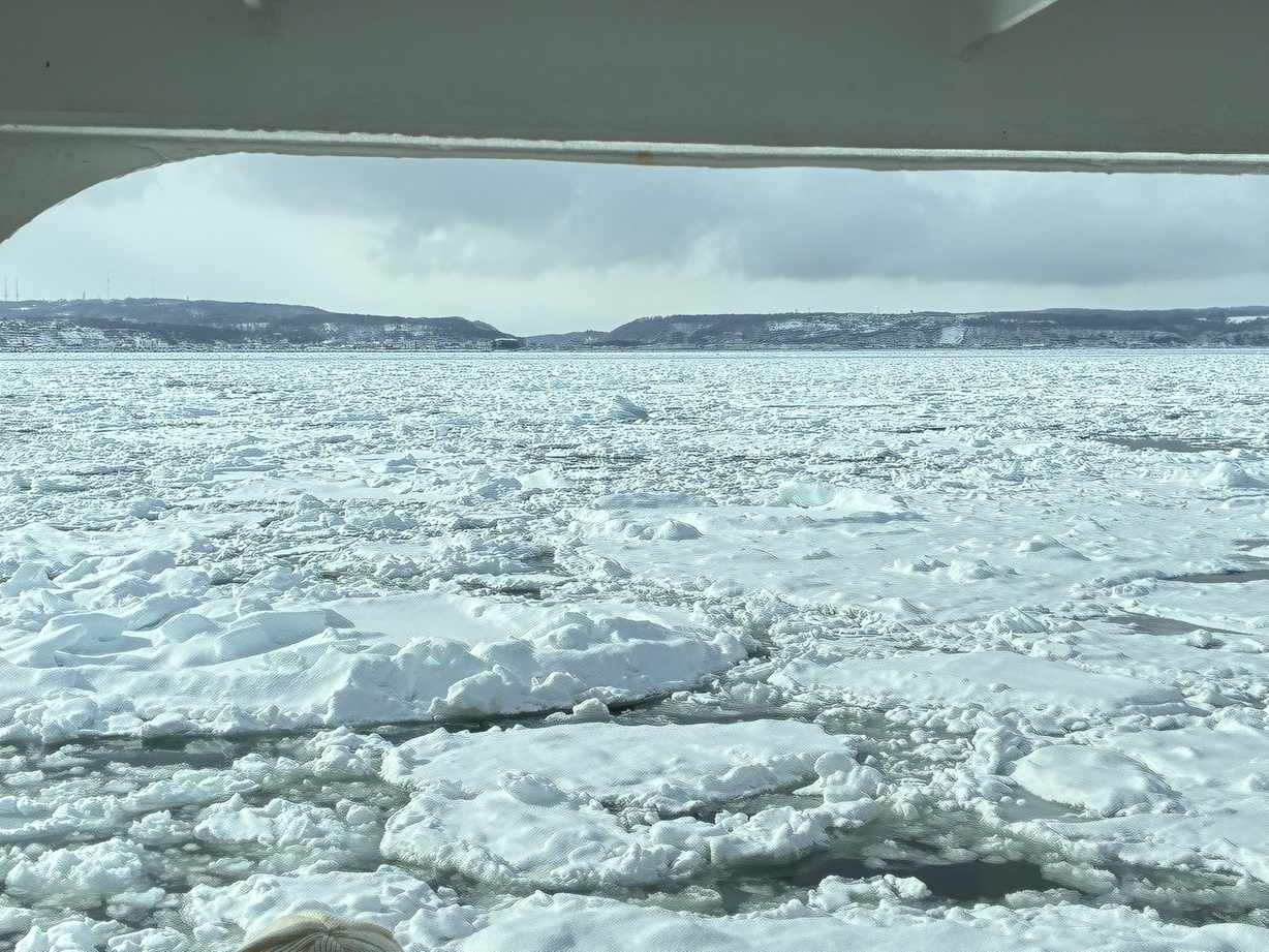 食べ終わってなんとなく窓から海を見ると流氷がだいぶ岸まで近づいてきているよう。上の写真と比較すればわかると思うのですが、港の堤防近くまで真っ白です。館員さんに聞いたところ風向きなどで本当によく動くのだそうです。