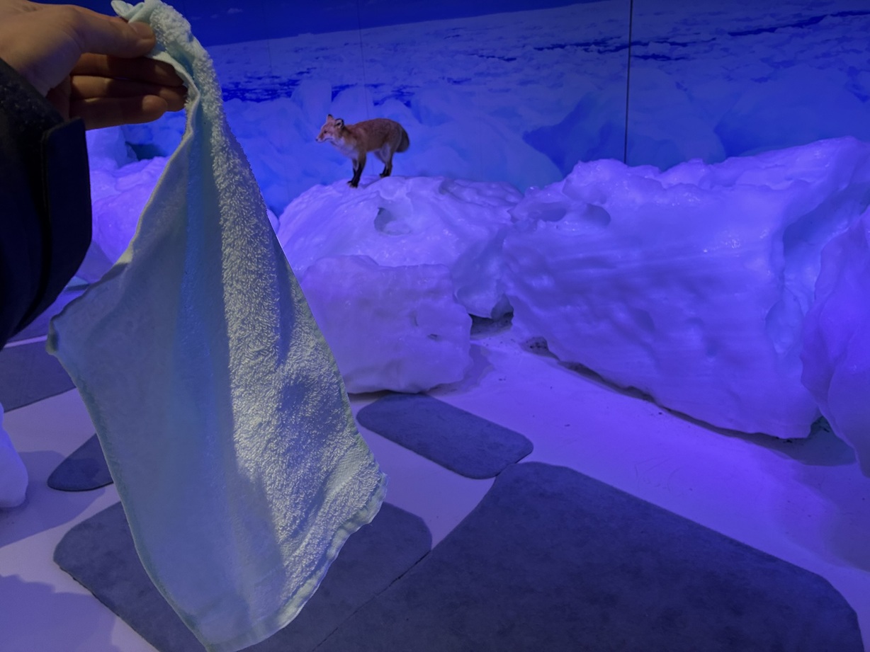 「流氷体感テラス」というのがあり、-15℃のなか本物の流氷が運んであります。入口で濡れたタオルを渡され「40回振り回してください」とのこと。やってみるとパキッと凍りました…これが目玉の「シバレ体験」だそう。昨日から何回かシバレているので、夏ならいいけどこの日はもういいかも…