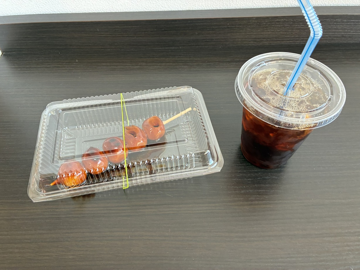 ここでもおやつでみたらし団子を買いました。暖かくてちょっと焦げているところが特に美味しい。コンビニもありアイスコーヒーと一緒に頂きました。