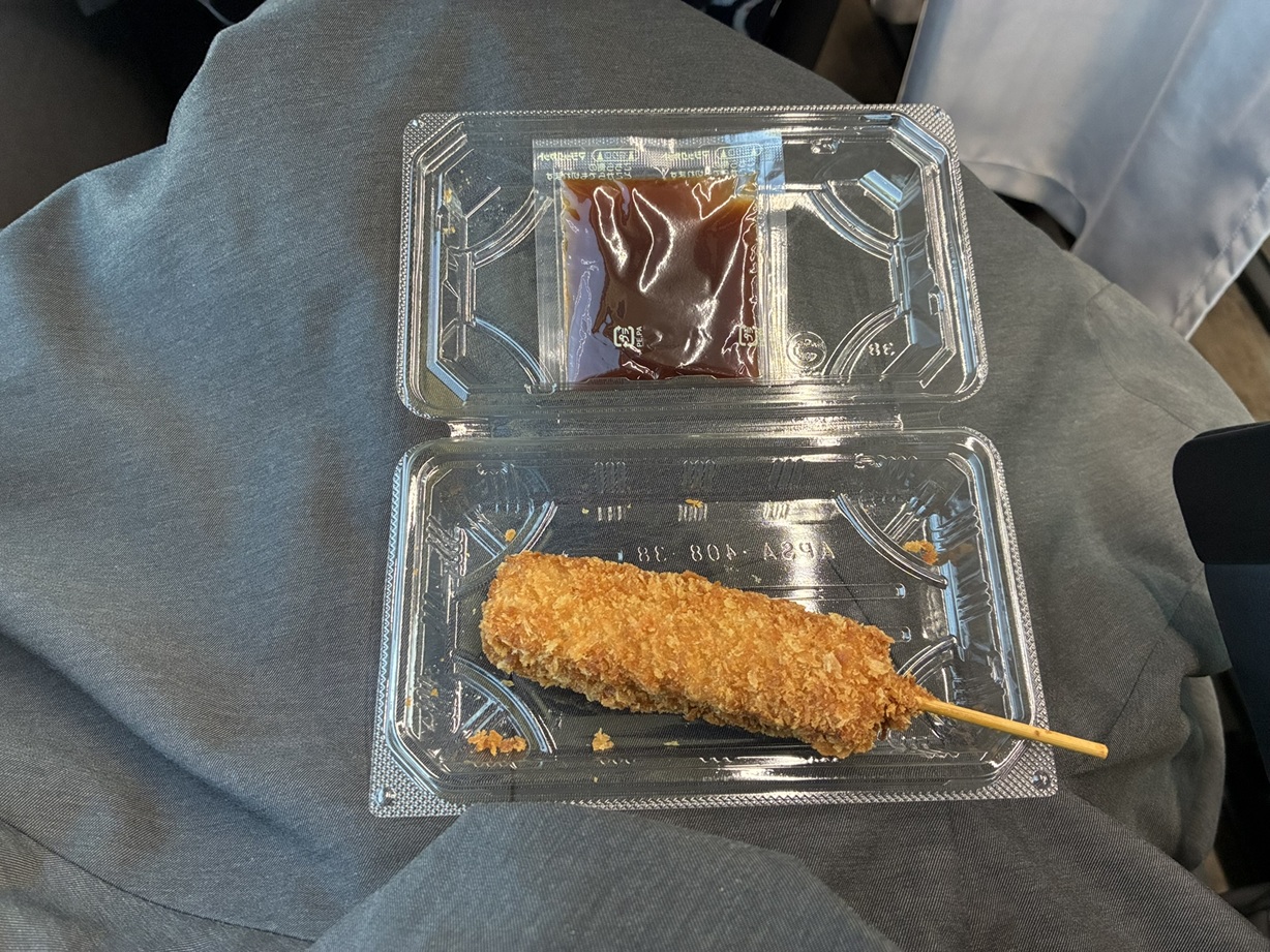 バスのトイレはできるだけ使いたくないのでトイレは必須。高速道路の旅はSAのB級グルメが楽しいということで期待していたのですが、そこまで惹かれるものはなく串カツをいただきました。