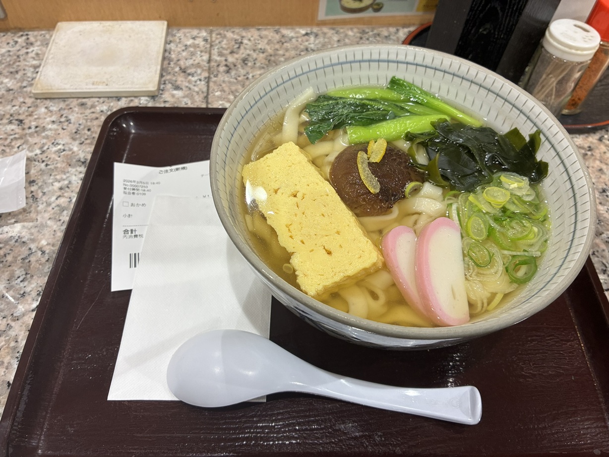 腹いせに食べたきしめん。「おかめ」なるメニューでだし巻き卵、小松菜そして好物のシイタケがのっていて栄養価的にも良さそう。シイタケはもちろんだし巻き卵が絶妙で美味しかったです。おかめに似せたとのことなのですがそうかなぁ?